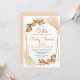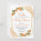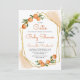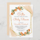 This citrus themed baby shower invitation features a gold geometric frame adorned with watercolor oranges. The customisable text is in modern orange handwriting script and black sans serif. Personalise it with the name of the mum-to-be and shower details. The back of the card is a pastel shade of orange matching the watercolor highlights on the front. Ideal for a summer baby shower!