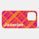 Iphone case featuring a plaid pattern in bright orange and magenta, and your custom name.