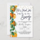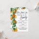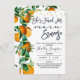 Elegant and modern orange themed bridal shower invitation. This design features a black brush calligraphy heading and a lovely citrus fruit and flower arrangement on the side as well as some gold glitter dots. This she's found her main squeeze, citrus themed bridal shower invitation is a sweet way to invite guests to an upcoming bridal shower.
