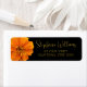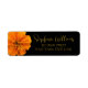 A return address label with an orange marigold flower and a combination of script and simple sans serif font on black background.