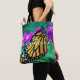 A close-up photo of a delicate, orange and black monarch butterfly resting on a bright magenta flower. Explore thoughts of warm, sunny days whenever you use this stunning, colourful photography tote bag. Makes a great gift for someone special!