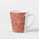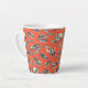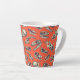 This latte mug features hand-illustrated dinosaur skulls in navy blue and cream on a bright red-orange background.