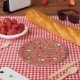 These paper plates feature hand-illustrated dinosaur skulls in navy blue and cream on a bright red-orange background.