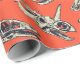 This gift wrap has hand-illustrated dinosaur skulls in navy blue and cream on a bright red-orange background.