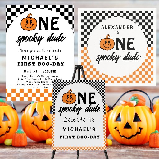 Orange One Spooky Dude Halloween 1st Birthday Invitation - Celebrate your little dude's big one in a spooky and fun way this Halloween season with this cute orange and black chequerboard retro smiley face pumpkin 1st Boo-Day Party Invite. Featuring black and white chequerboard and orange and white chequerboard, classic Halloween colours. A smiley face pumpkin with lightning eyes adds to the fun, retro spooky season theme. Customise this editable first birthday party invitation template for boys with your own event details. Available as a digital download, easily send it via email, text or social media.