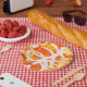 Bright orange confetti design puts a celebratory tone to any event. Art by Jeannine Romero for OutsideThePot.