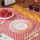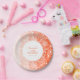 Orange shade colour stripes with floral design birthday paper plate. Simple trendy party supplies perfect for a stylish female bday celebration.