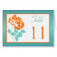 This turquoise, white, and orange floral table number card matches the invitation and other items shown below. You must change the number "11" to each of the numbers you need, add the card to your cart, and then repeat the process until you have all the numbered cards in your cart. If you require any other matching items, please email your request to niteowlstudio@gmail.com.