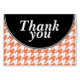 These classy, all purpose thank you cards are designed with "thank you" in bold italic white letters in a black semi-circle over an orange and white houndstooth pattern. This pattern is a stylish choice for Weddings, Bridal Showers, and Anniversaries.