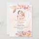 This beautiful baptism or christening invitation features a lovely peach, neutral watercolor background with orange pink floral, and a gold cross in the centre. The back of the card is soft peach flowers and background.