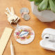A personalised keychain with a peach and white striped pattern. Layered over top is an orange and pink floral arrangement with green leaves. A diamond shaped frame layered over top with your personalised text inside.