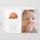 This chic gender-neutral 1st/first birthday photo invitation features an orange pumpkin with autumn/fall leaves and an acorn on a white background. The reverse side features a white background with black buffalo/gingham check patterns. Personalise it for your needs. You can find matching products at my store.