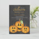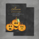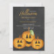 This design features a Halloween party, a fall celebration, with orange, pumpkins, a Jack O'Lantern, a black background, a whimsical, kids' adult party, with a cute, funny style