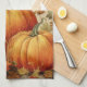 Kitchen towel with a rustic illustration with orange pumpkins and fall leaves. An autumn grunge vibe.