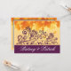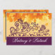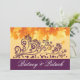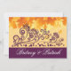 Orange Purple & Brown Fall Leaves Wedding Invitations--Match the RSVP cards & entire suite found below on this page. Each invitation features an elegant leaf design on both sides in various vibrant shades of orange--like burnt orange, as well as yellow hues and accents or red over top a peach like coloured background The front of each invite also features a dark purple flourish for added flair. These autumn themed wedding invitations are set to high quality basic card stock; however, you can change the stock to linen, felt (embossed), recycled, and several metallic shades if you would like under number 2 (choose your style, size & paper type) below the orange add to cart button. A list of the additional costs for a fancier card stock are displayed also under that option. Each invitation comes with a fitted white envelope.