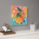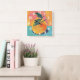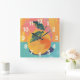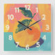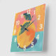 This vibrant image features a colourful, stylised orange with green leaves, set against a lively pink and orange background. The artwork has a playful and modern pop art feel.