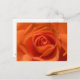 This post card features a close up photo of the swirling petals of a vividly orange Rose blossom.