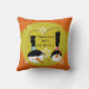 Orange Snowman Melt My Heart holiday pillow, so cute and colourful, features a polka dotted orange background with a circle polka dots on mustard, and a snowman and snow lady with big carrot noses and tall black stovepipe hats with a mustard heart that reads Snowmen Melt My Heart!