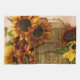 A still life of a tin basket filled with orange sunflowers with a textured background.