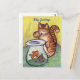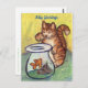 Word on note card note "Kitty Greetings" but can be changed to make your own custom greeting card message. Art features an orange tabby cat with a raised paw over a goldfish bowl. Make your own custom cat lover gifts with personalised messages!