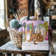 Orange tabby cat sitting on a counter top in the kitchen. The cat thinks it is funny you want him off the counter. Books, cookies, plant and utensils are all around the coat on the counter in a backdrop of purple.