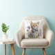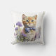 Sweet accent throw pillow, with watercolor artwork of a orange tabby kitten, with a purple bow tie and sitting in a bed or purple flowers. Lovely gift idea for any cat lover.