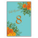 Orange & Teal Aqua Peony & Rose Floral Wedding Table Number