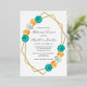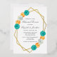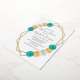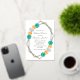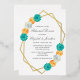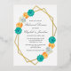 Orange ranunculus, white rose and teal floral rehearsal dinner design on a geometric frame
