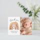 These adorable baby shower thank you cards feature boho style and trendy handwritten script. This lovely elegant new baby arrival announcement and thank you card includes two photos (one on each side) and classic typography. On the front, there is a cute newborn baby announcement including a name, date of birth, height, and weight under the orange terracota neutral boho watercolor painted rainbow and a lovely detail of a heart within it. The side part features the vertical photo. The back of back features a thank you message (you can use it to thank about baby shower gifts and the care and attention you´ve got during pregnancy). There is also a second horizontal photo. To customise this card, simply click on the ´´Personalise´´ button and change all details, including photos, to your own. Though especially good for a fall or autumn shower, this lovely thank you card will be the perfect way to say thanks any time of the year. It is also perfect for a Baptism or Christening. Would suit both baby girl and baby boy.