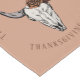 This Western Thanksgiving or Friendsgiving custom table runner features a hand-drawn Western cow skull adorned with roses illustration in black ink, with the editable text, "Thankful, Grateful & Blessed". Personalise with your event and year. The centre features the editable text, "Happy Thanksgiving" in script. Elegant orange background.