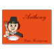 Orange custom Thanksgiving table cards with hungry pilgrim and customisable text.