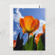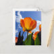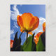 Bug's-eye view of a bright orange spring tulip against a blue sky.