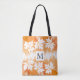 Modern orange maple leaf watercolor wash and monogram tote bag. It features borders of white maple leaves on orange watercolor wash and your monogram in a frame with outline placed in the centre.
