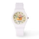 Personalised watch with a watercolor illustration of an orange pumpkin decorated with colourful fall leaves and sprigs. Background is a digital image of a faux parchment texture created with watercolors. Art deco clock face.