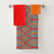 This towel set has an orange washcloth, a red hand towel, and a bath towel with a Boho design of orange and red waves on a field of grey.