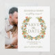 Experience sophistication with this refined and contemporary rustic Save the Date photo invitation. Enhanced by a delicate wreath of orange watercolor flower blooms whreath, this elegant design offers further personalisation by featuring a couple's photo on the back.