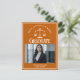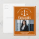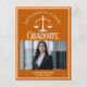 This custom orange law school graduation announcement postcard features white typography for a class of 2024 graduate above your student photo. Customise with your graduating year under the scales of justice and photograph for a great personalised lawyer or attorney postcard.