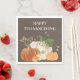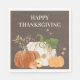 Brown "Happy Thanksgiving" paper napkins with pretty orange and white pumpkins and glittery gold fall leaves