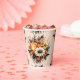 Paper cups with an elegant yet goth style flower bouquet. Composed of orange tulips, yellow daisies, grey leaves and sprigs and some orange berry accents.