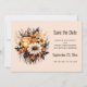 Save the date card with an elegant yet goth style flower bouquet. Composed of orange tulips, yellow daisies, grey leaves and sprigs and some orange berry accents.