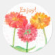 A colourful sticker with "Enjoy" decorated with three zinnia flowers in shades of red, pink, and orange with watercolor and touches of spatter in the background for added colour. In the Language of Flowers zinnias mean thoughts of absent friends. Cheerful finish to your packaging!