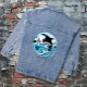 An orca jumping out of the ocean with water all around. Mountains and blue sky all around the killer whale drawn in an art nouveau tattoo style.