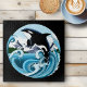 An orca jumping out of the ocean with water all around. Moutnins and blue sky all around the killer whale drawn in na art nouveau tattoo style.