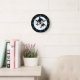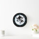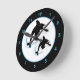 Two beautiful and graceful black and white Orcas, are playful and jumping while swimming in the ocean. Orcas are also known as killer whales. The numbers are blue on a black frame surrounding the clock face. There is also a thin blue outline around the clock face.