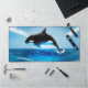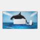 This lively illustration of an orca whale is sure to bring life any one's desk or computer space! The whale, sometimes called the killer whale, is leaping out of the ocean. Water is dripping from the whale and the water shows movement as well. Blue colours are bright bring out the black and white of the orca whale.