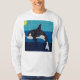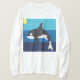 Artistic depiction of an orca whale in the ocean, illuminated by a vibrant sun in the background.