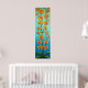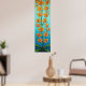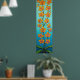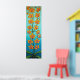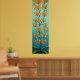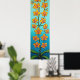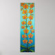 Stylised painting of orange sunset coloured orchids on a striking blue/azure background.