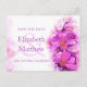 Beautiful stylised loose watercolor orchid flower with heart shaped petals in purple pink wedding save the date invitation. Edit this save the date wedding card with your own words. Unique design and original painted watercolor art by Sarah Trett.