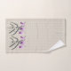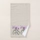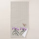 Purple Arundina botanical orchid engravings paired with an antique watercolor butterfly on a creamy tan stripe background bath towel set has a coordinating shower curtain, bathmat, and toothbrush holder/soap dispenser set.