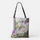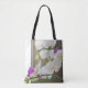 White and purple Phalaenopsis Orchids on an all over printed tote bag that comes in various sizes